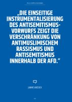 Im vorliegenden Beitrag wird eine Untersuchung zum Sprechen über Antisemitismus, Judentum und Israel in Äußerungen von AfD-Abgeordneten anlässlich des Holocaustgedenktages 2020 vorgestellt. Als Datengrundlage dienen 276.100 Tweets, die von 243 Abgeordneten veröffentlicht wurden. Mit der Methode des Text-Minings lässt sich verdeutlichen, dass die „Juden in der AfD“ bei den untersuchten Themen für die meisten Inhalte verantwortlich sind und somit eine besondere Funktion für die Partei erfüllen. Der inhaltliche Fokus liegt dabei stets auf Warnungen vor einem vermeintlich neuen muslimischen Antisemitismus. Darüber hinaus zeugen die Tweets am Holocaustgedenktag von einer inhaltsleeren, abstrakten Form der Erinnerung, in der weder die Opfer noch die Täter*innen oder gesellschaftliche Strukturen, die zum Holocaust führten, benannt werden.